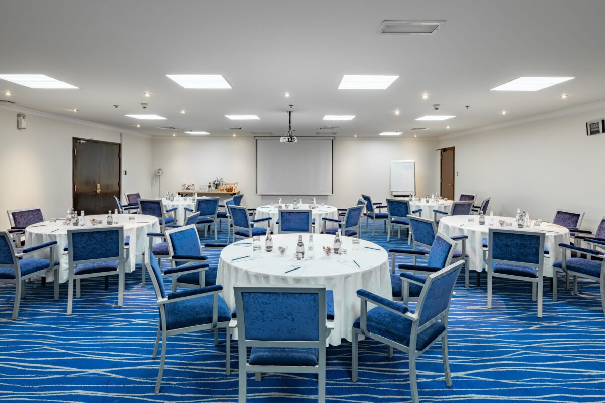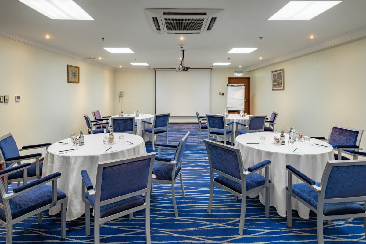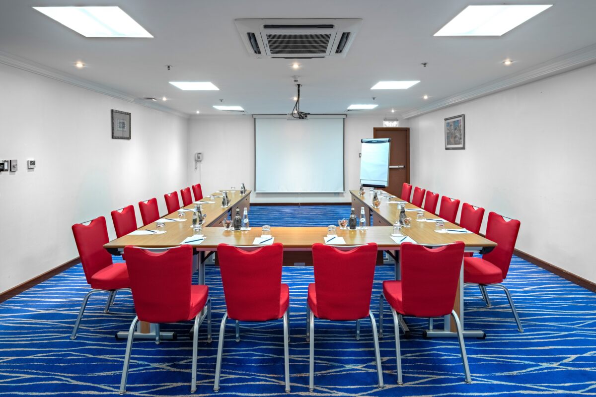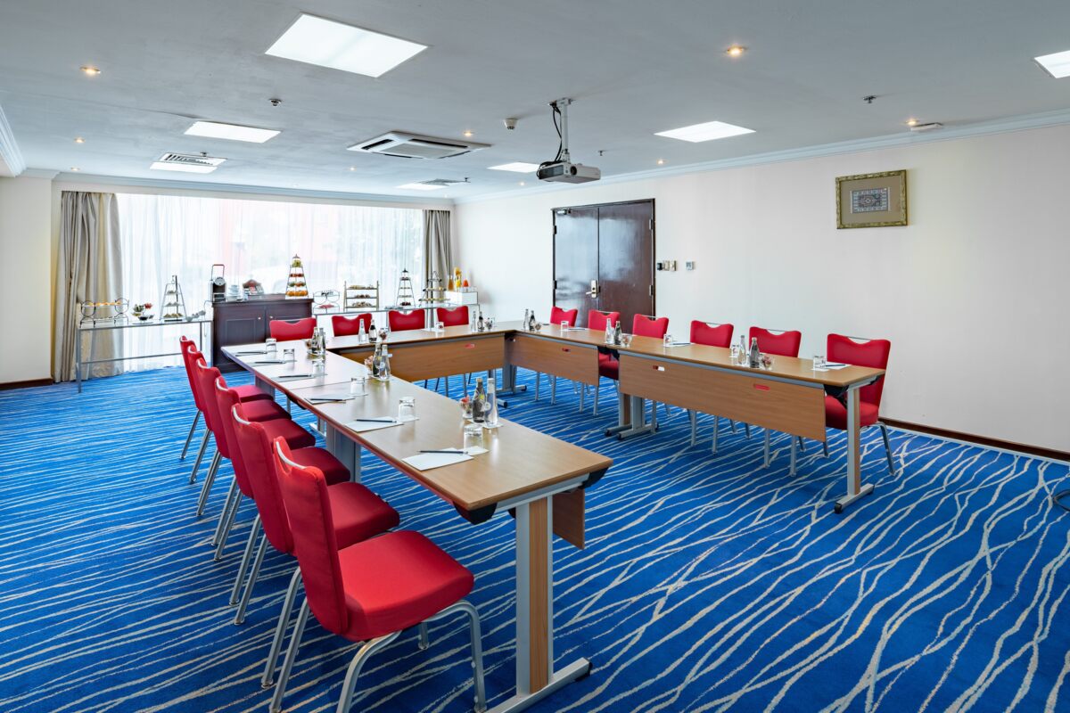 The Umluj Meeting Room features a ceiling height of 2.45 meters and is equipped with multiple power sockets for convenience. The room can be divided upon request, making it ideal for both intimate meetings and flexible event setups.